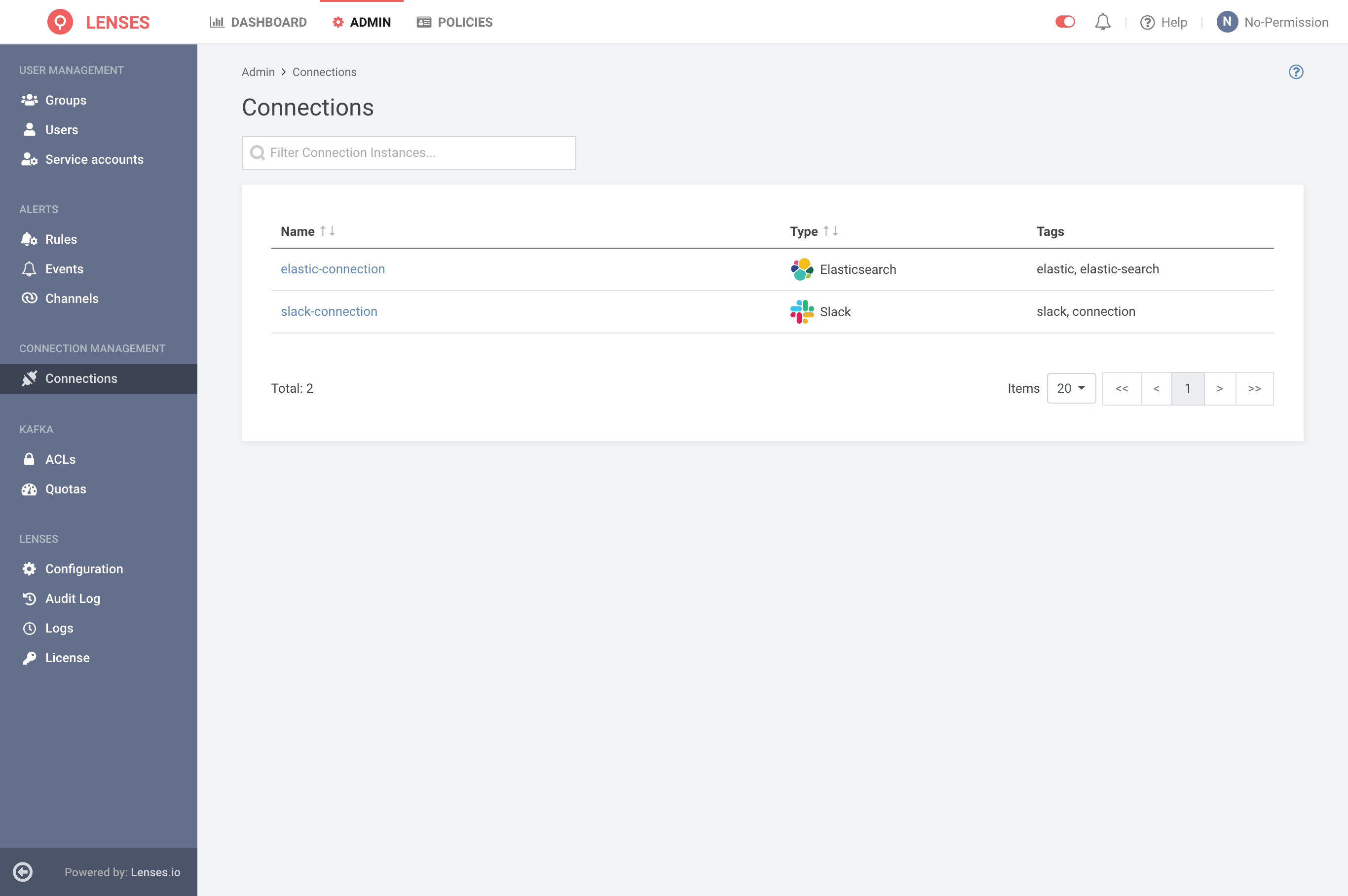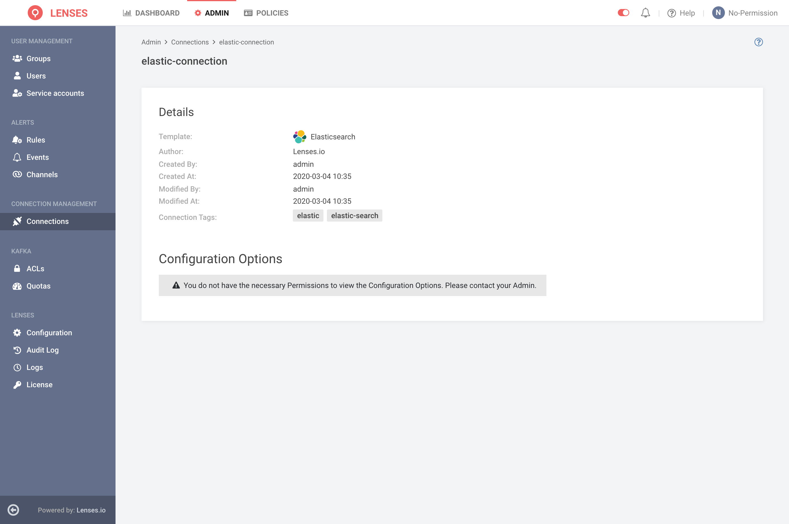 or All Lenses Users should be able to see the listing and details page for the connections. Users require  `Manage Connections` permission to **View Sensitive Data**, **Add**, **Edit**, and **Delete** a Connection.