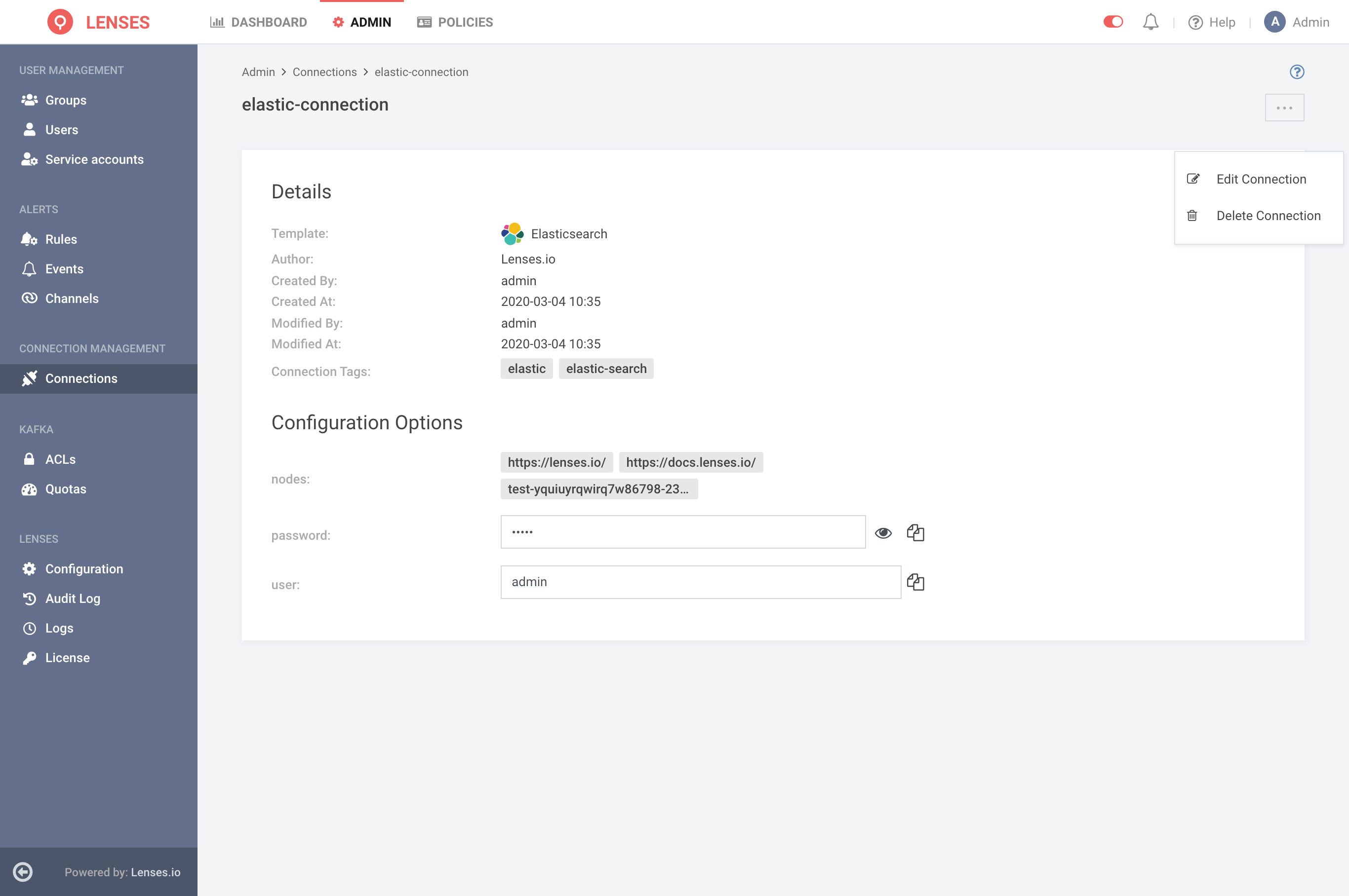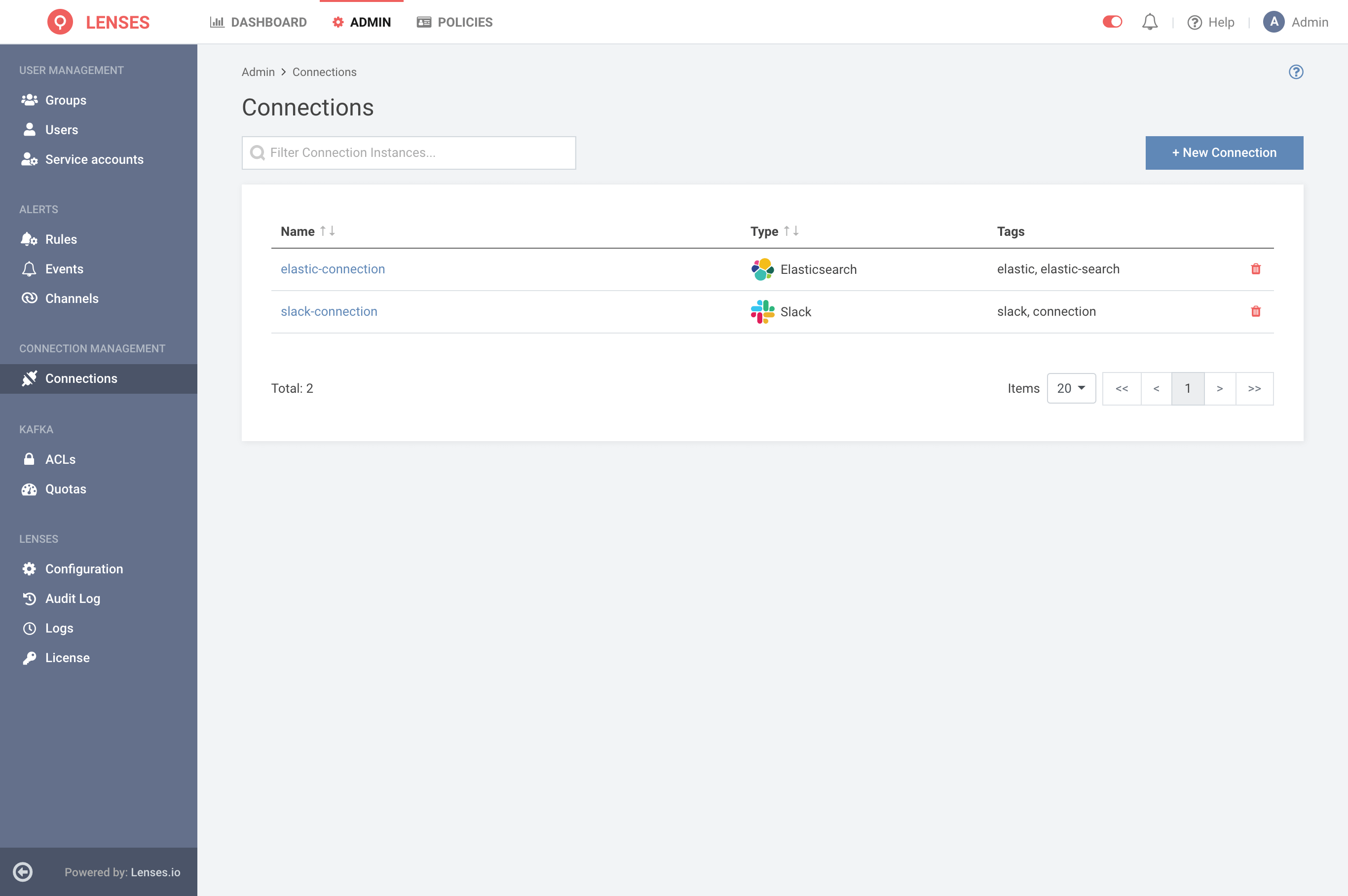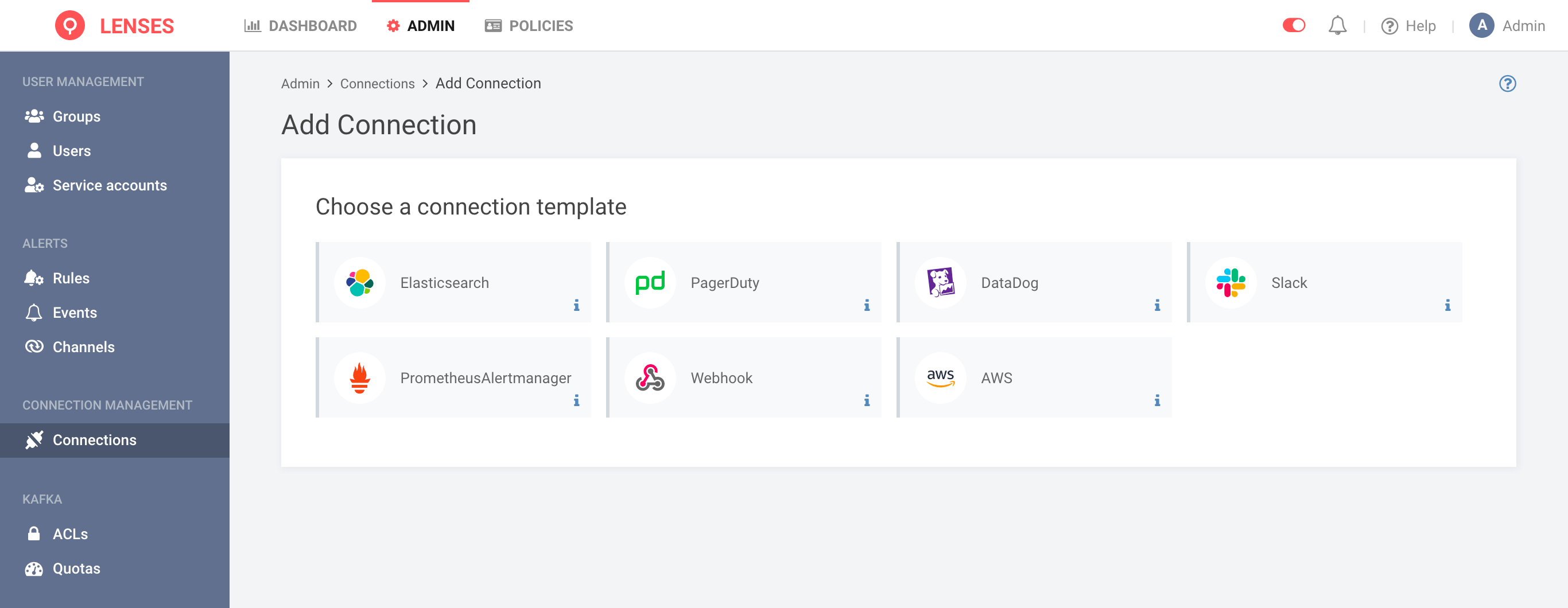Lenses securely store the connection details. Connections connect external systems like Elasticsearch, Slack, PagerDuty, DataDog, Webhook, and Alert Manager.
