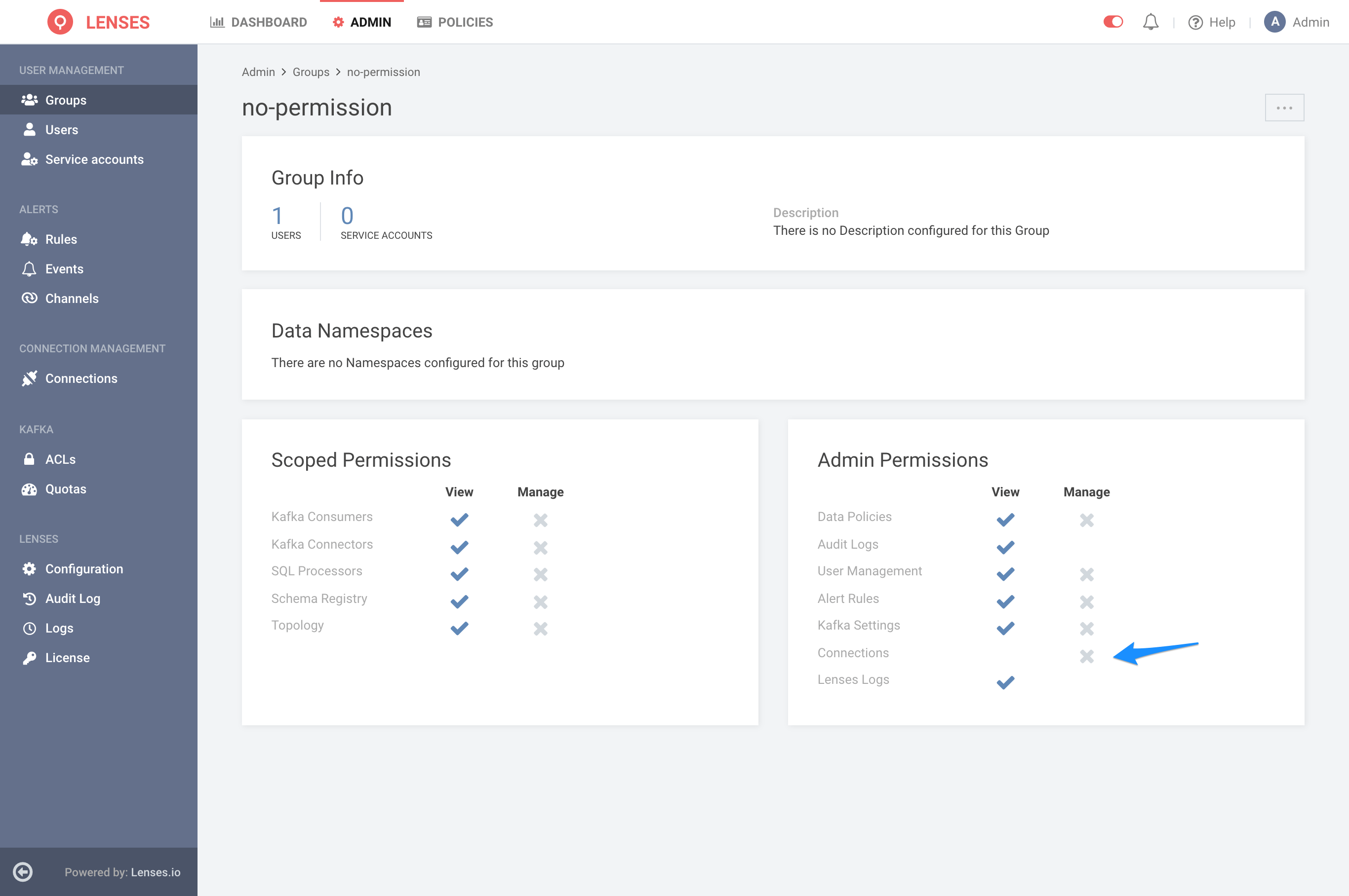 | Connections / Manage | Admin | Allows to add/remove/update connections |