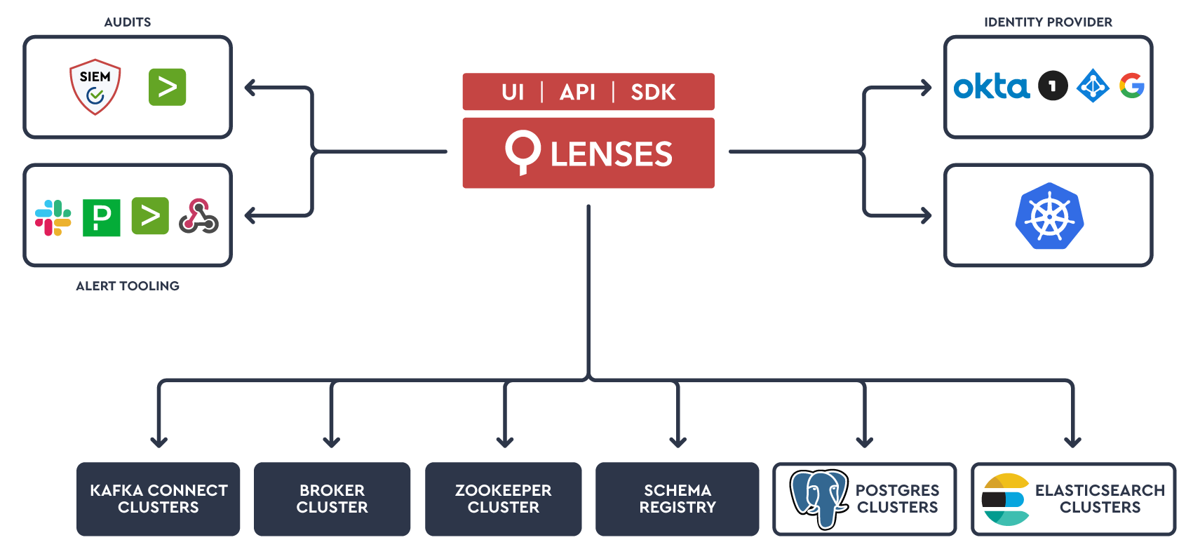 The diagram gives a high-level overview of the logical components. At the core of Lenses, we have: