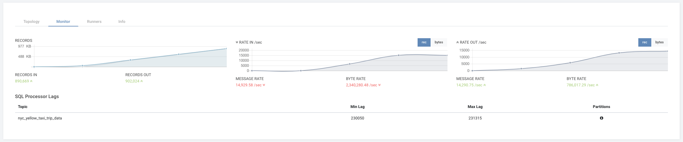 Each SQL Processor exposes metrics that Lenses picks up out of the box. These are visible from the UI and allow the user to see how a processor performs.