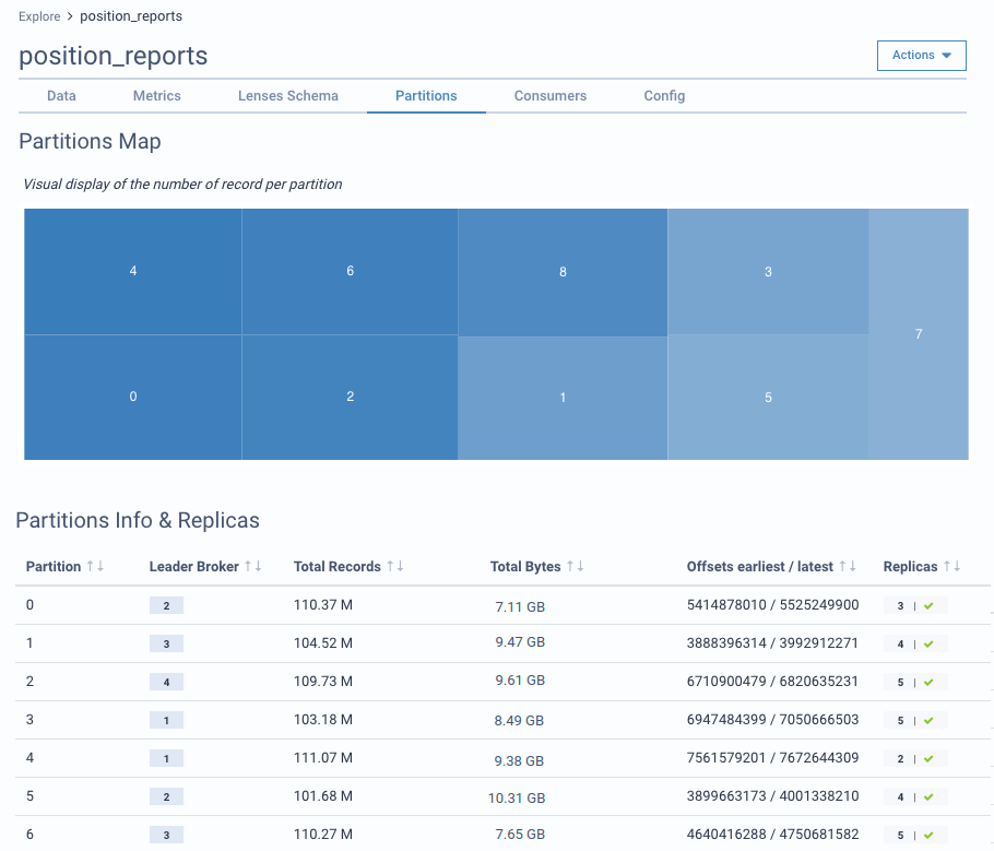 Lenses add observability and health monitoring of Kafka partitions. The visual map displays the number of messages currently stored per topic partition. Using this map, you can quickly identify if a partition has been over-utilized and requires rearranging the partitioning strategy.