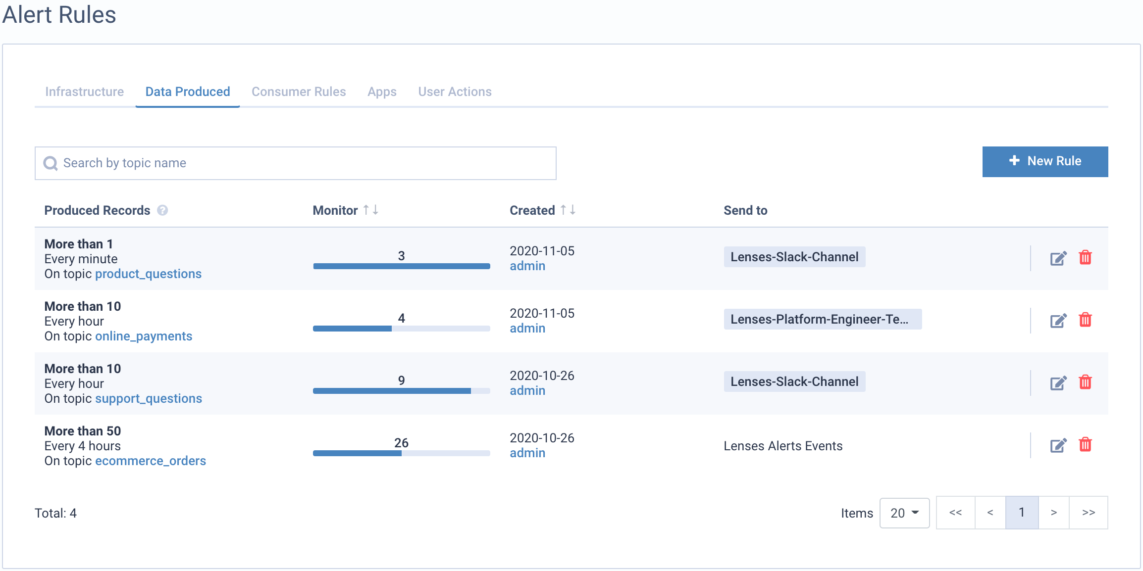 Lenses monitor your topics and provide visuals to help you ensure health status on data production/consumption and distribution.