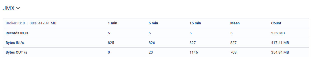 **JMX** On the bottom of the metrics page, a data table is available. This summarizes key topic metrics across your cluster sourced by JMX if enabled.