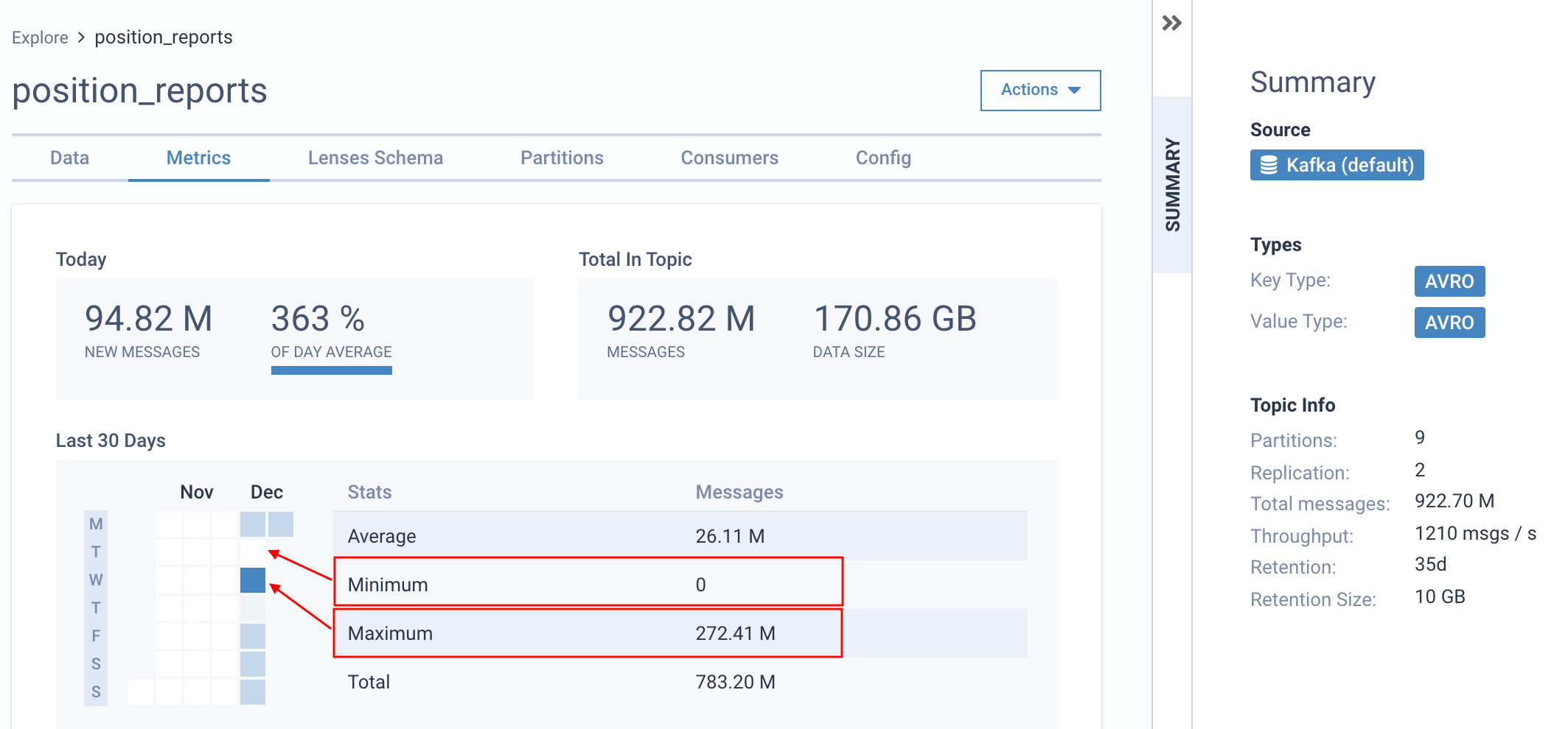 The above highlights the messages produced on the Kafka topic over the last 30 days. The minimum, average and maximum number of daily events are visualized to enable you to identify your producers' real behavior easily.