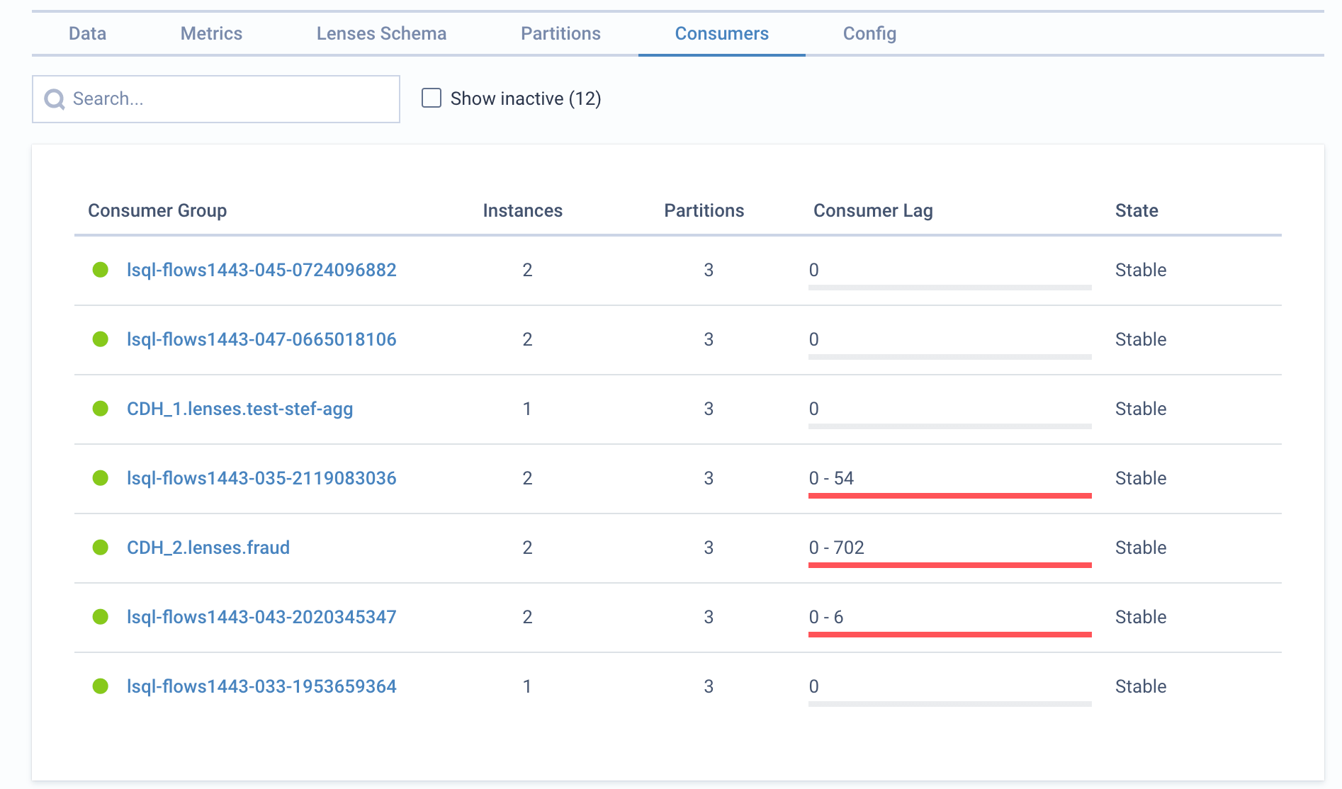 For each topic, you can view its consumers. The lag is visualized in a bar by showing each partition's minimum and maximum consumer lag. Drill down to the consumer details to see each partition.